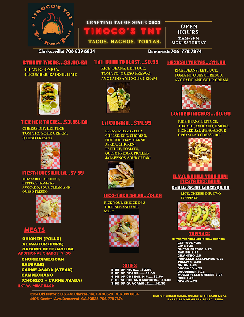 Your choice of meat accompanied by cheese dip,lettuce, tomato, sour cream and queso fresco and your choice of salsa verde or salsa roja. The price is $3.99 each. If your choose carne asada or chorizo there will be an upcharge of .50 per taco.